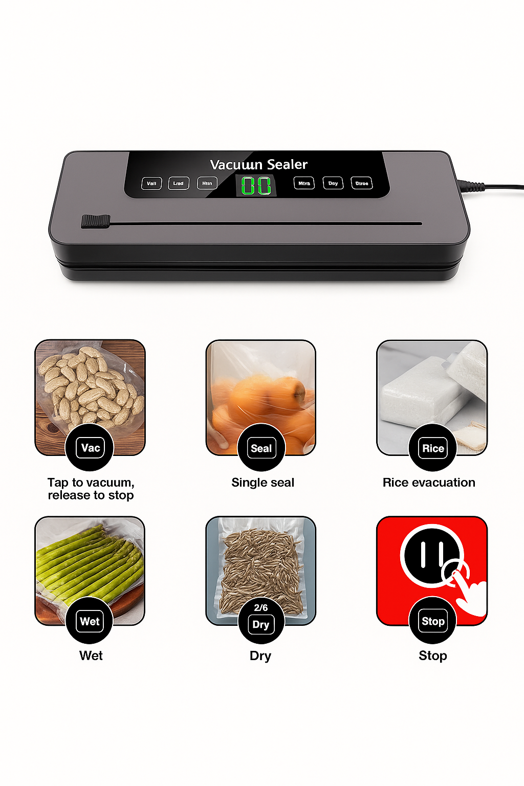 Frische leicht gemacht! Unser elektrisches Vakuumiergerät entfernt effektiv die Luft aus Ihren Beuteln, um Lebensmittel länger haltbar zu machen. Perfekt für Fleisch, Gemüse, Käse und mehr – spart Platz, vermeidet Verschwendung und bewahrt das volle Aroma.